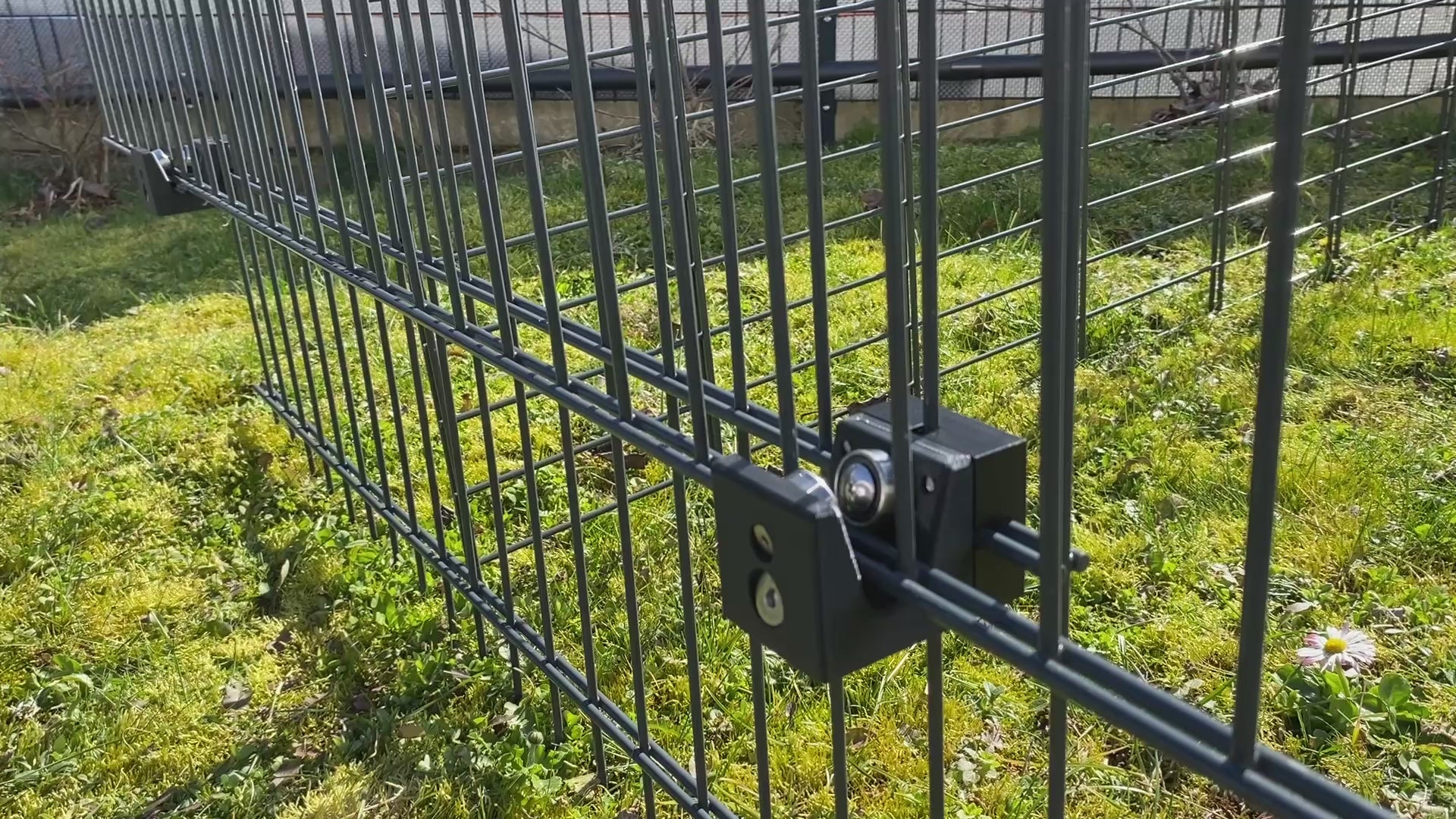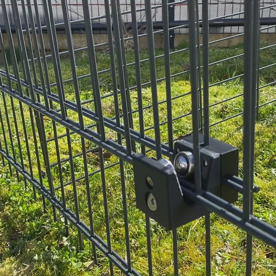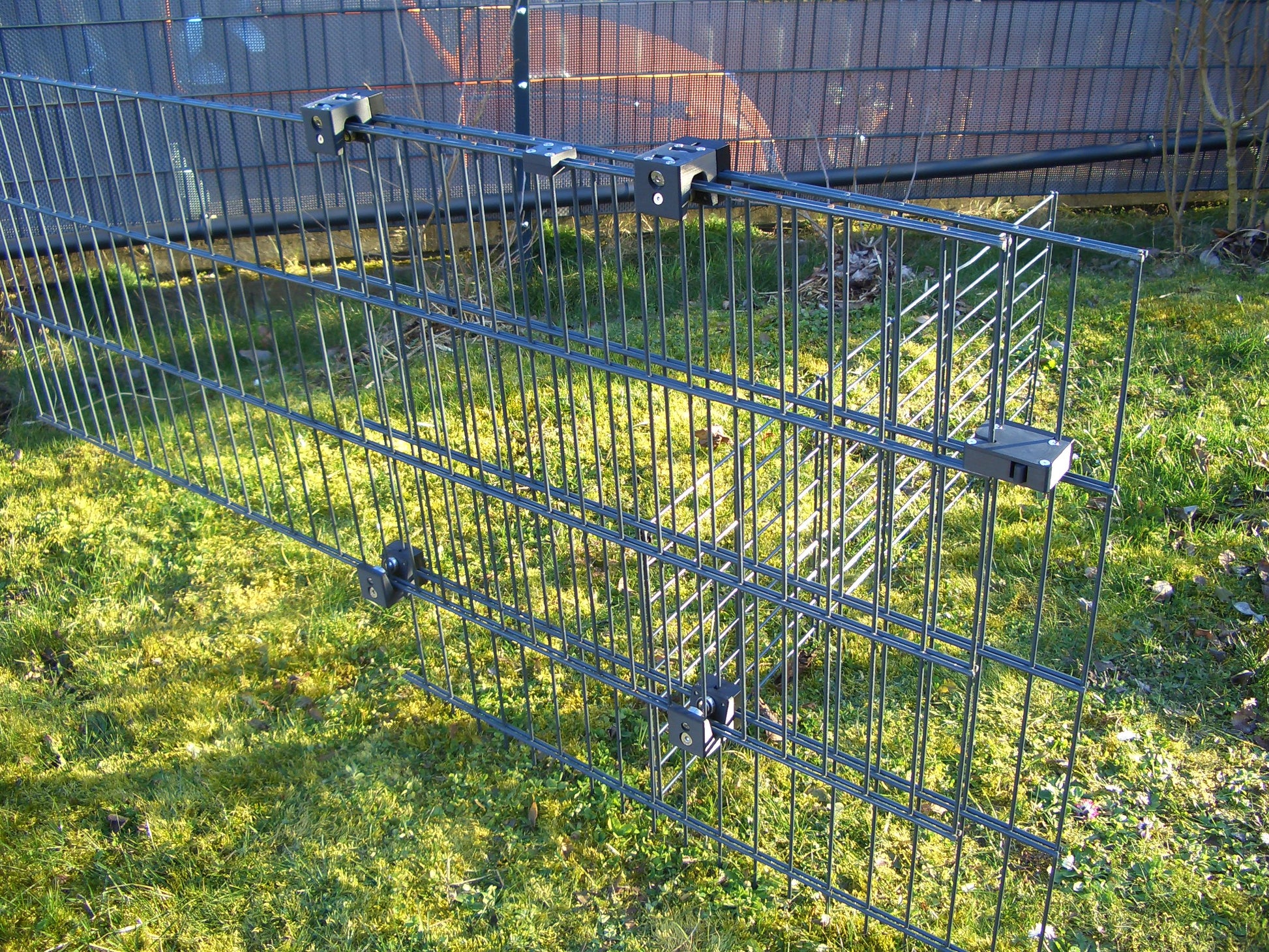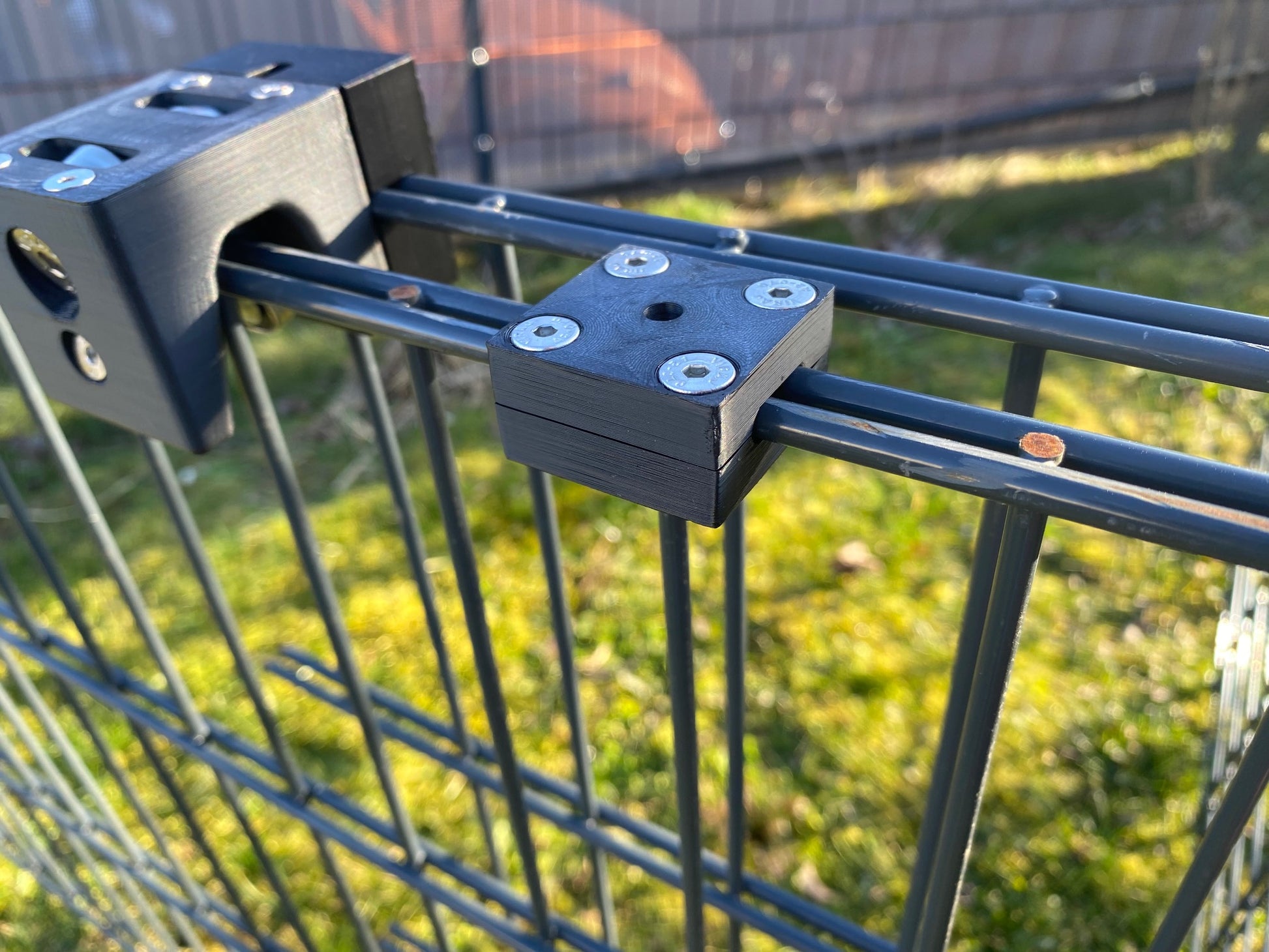 Die Schiebebeschläge (4 Stück) werden an eine bestehende Doppelstabmatte geschraubt. Eine weitere, auf gewünschtes Maß zugeschnittene Doppelstabmatte wird in die Schiebebeschläge eingeführt.