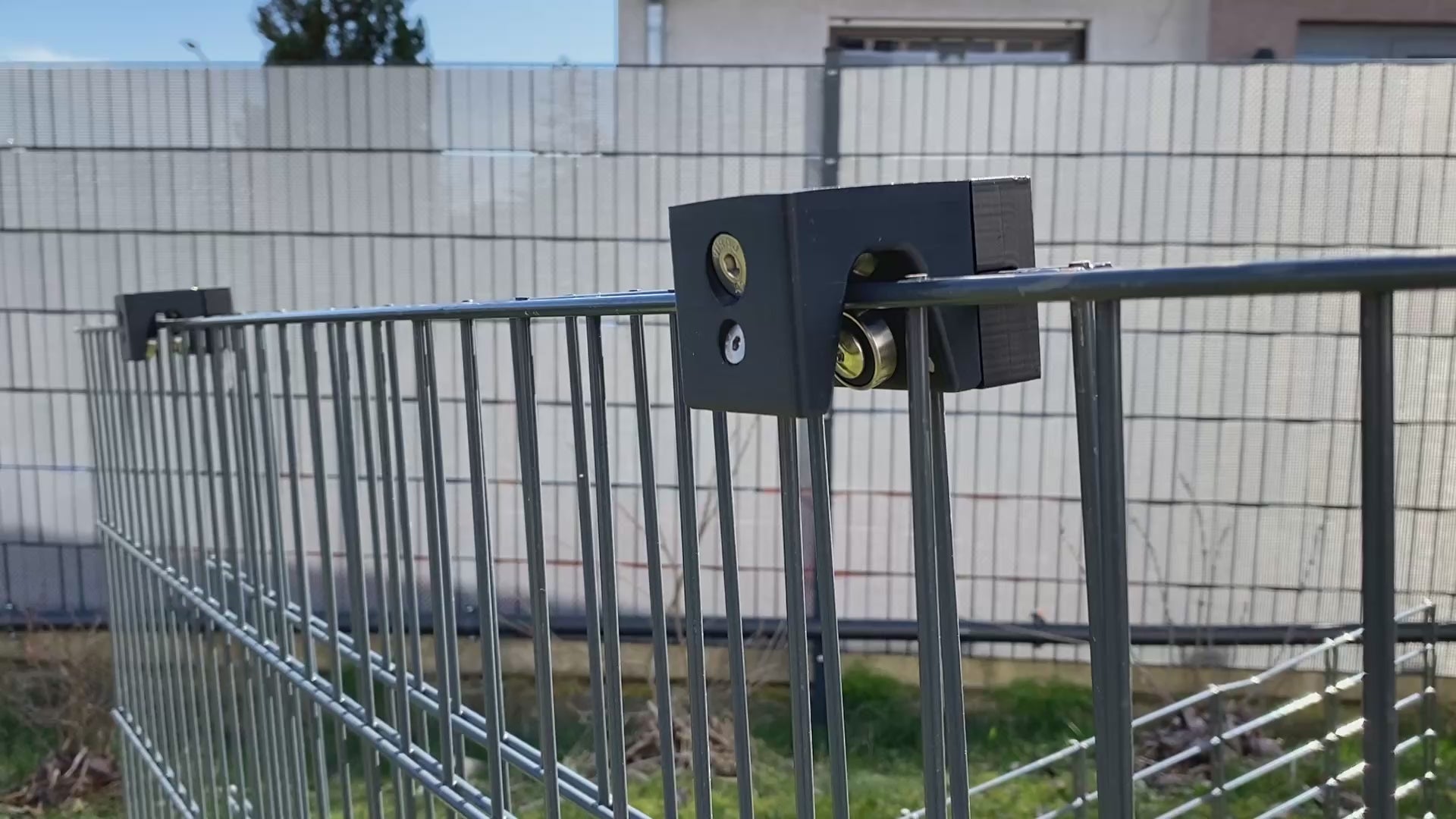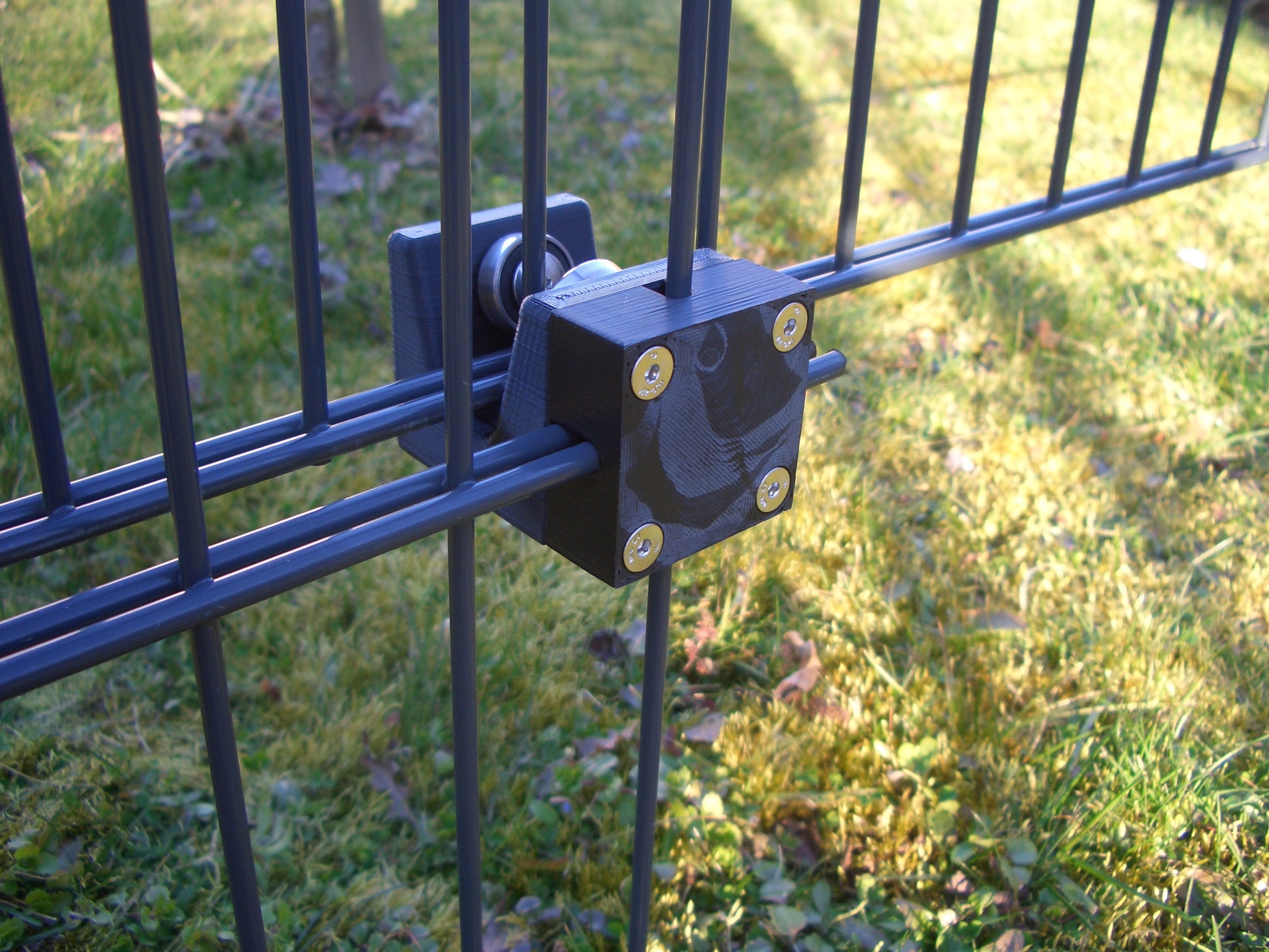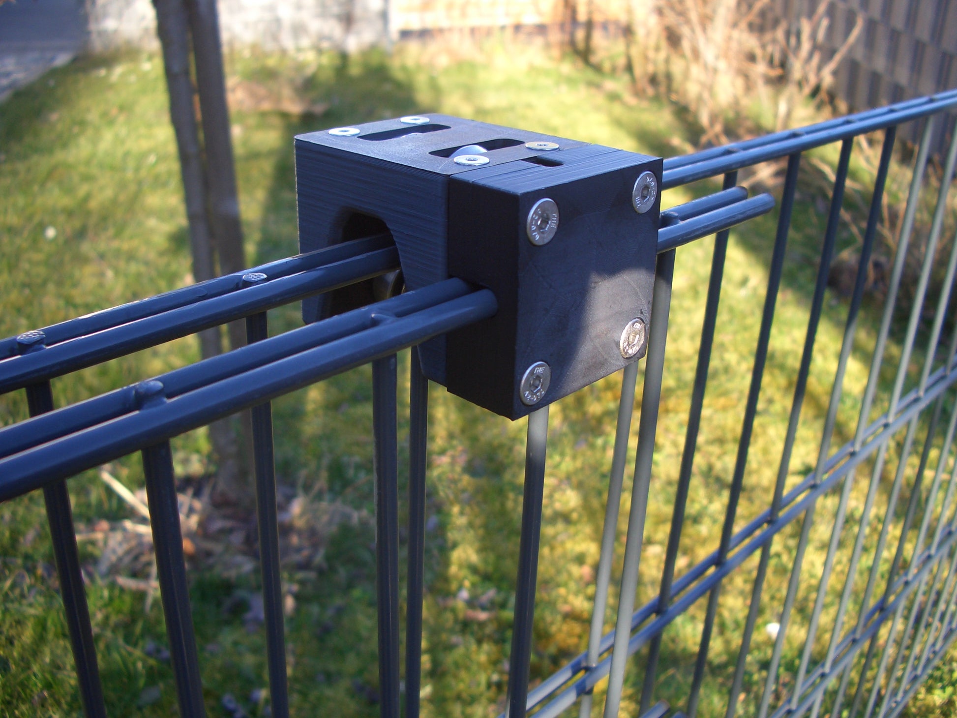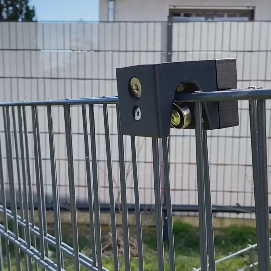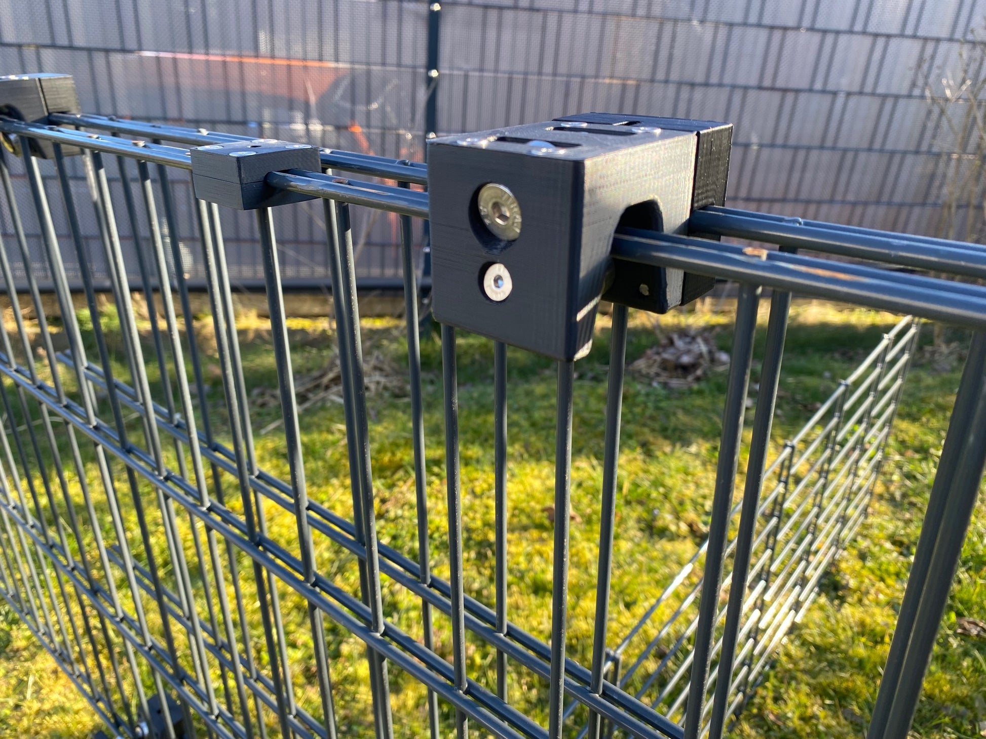 Die Schiebebeschläge (4 Stück) werden an eine bestehende Doppelstabmatte geschraubt. Eine weitere, auf gewünschtes Maß zugeschnittene Doppelstabmatte wird in die Schiebebeschläge eingeführt.
